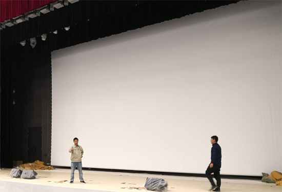 另一個技術(shù)難題就是現(xiàn)場安裝這超過14米大幕,XY銀幕為了把服務(wù)做到最好,由研發(fā)技術(shù)部郭經(jīng)理帶領(lǐng)相關(guān)技術(shù)工程師,共10多個人,直接乘坐火車到達(dá)現(xiàn)場,由郭經(jīng)理指揮安裝。