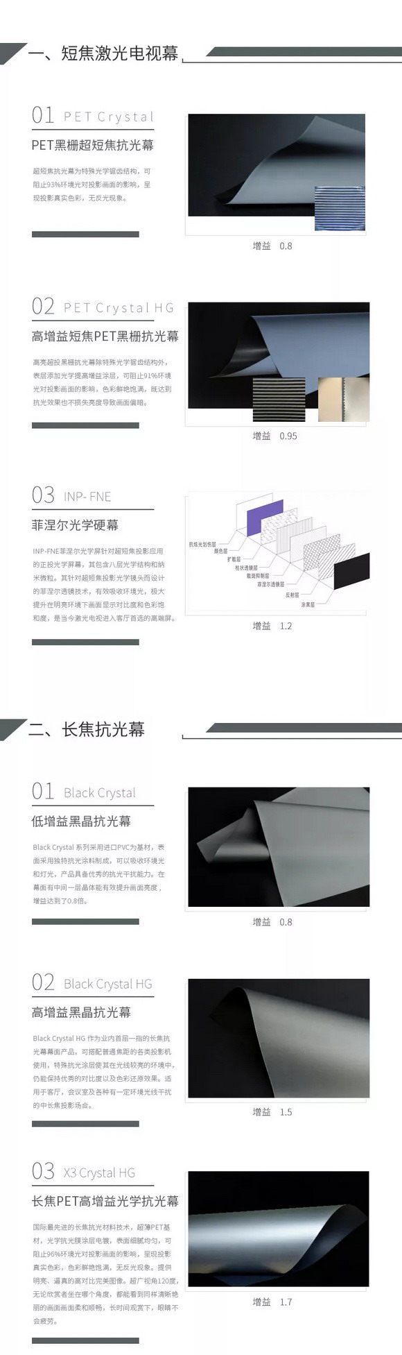從第一代白墻,至第二代白塑幕;第三代玻珠幕;第四代金屬幕,玻纖白幕,PVC軟彈幕;第五代微孔透聲幕,編織透聲幕,高增益幕;第六代抗光幕 ,黑幕;未來(lái)投影幕將會(huì)朝著更健康、更護(hù)眼、更高還原度的方向發(fā)展。