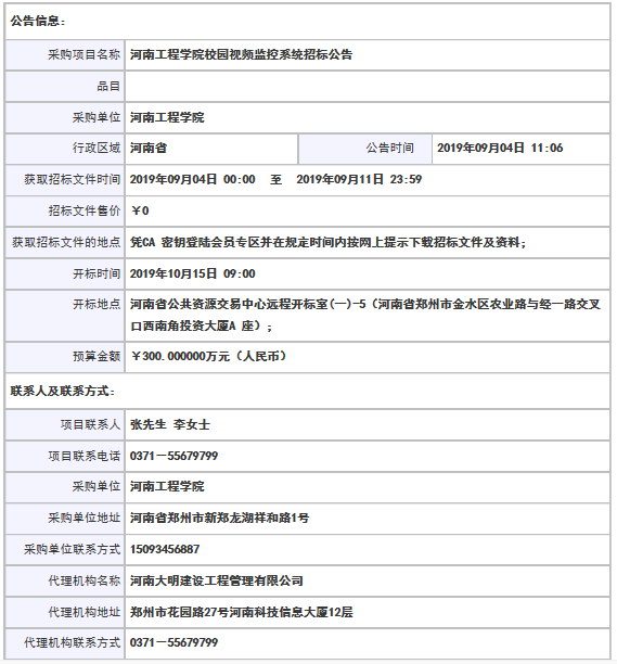 河南工程學院校園視頻監(jiān)控系統(tǒng)招標公告