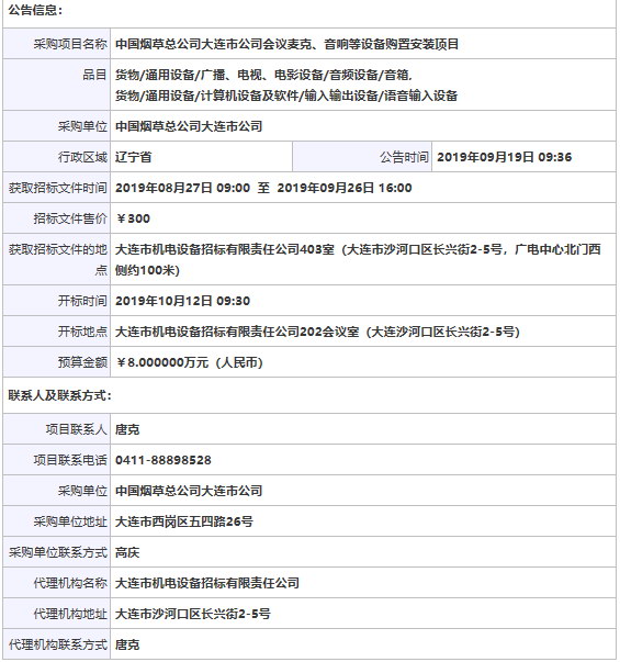 采購項目名稱: 中國煙草總公司大連市公司會議麥克、音響等設備購置安裝項目