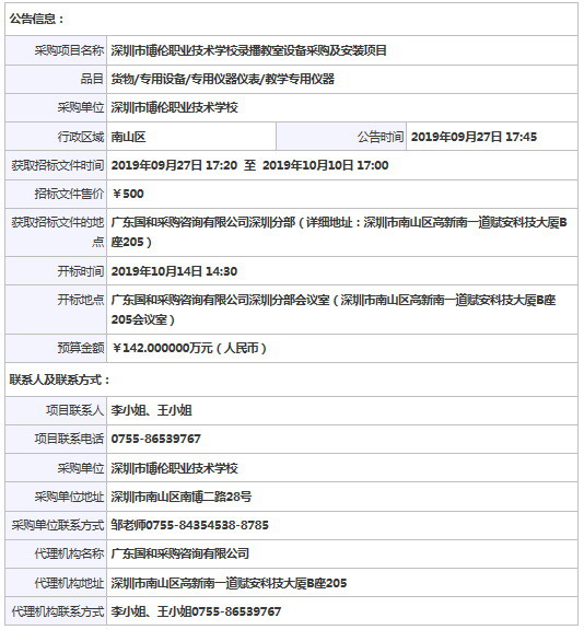 開標地點: 廣東國和采購咨詢有限公司深圳分部會議室(深圳市南山區高新南一道賦安科技大廈B座205會議室)