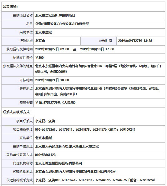 采購項目名稱: 北京市監獄LED 屏采購項目