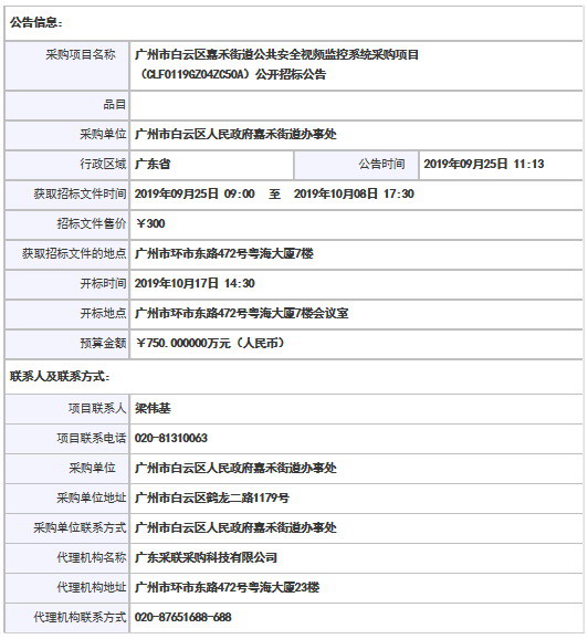 采購(gòu)項(xiàng)目名稱: 廣州市白云區(qū)嘉禾街道公共安全視頻監(jiān)控系統(tǒng)采購(gòu)項(xiàng)目(CLF0119GZ04ZC50A)公開招標(biāo)公告