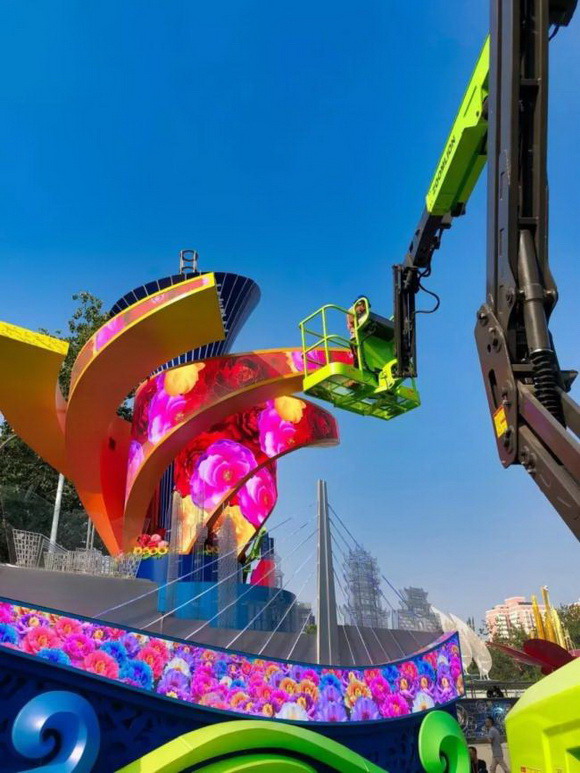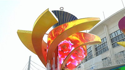 彩車中的六片花瓣,采用的是美亞迪戶外P3柔性異形花瓣屏,每片重達1噸,細長的曲面形,伸開在7米多處的高空,因為在空中平衡的不好把握,易側翻,也加大了安裝的難度,工程人員反復開會論證,重新改造花瓣結構,先把六片花瓣組裝好,最后再整體吊裝上去。