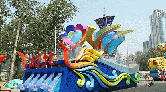 “湖北彩車”呈楚鳳凰造型,身長15米,高10米,寬6米,體重30噸。彩車前部的心形顯示屏,意為兩江交匯;左右兩側裝有曲面顯示屏,展示湖北景觀;車體7米多高處六片巨大的花瓣也是顯示屏,迎風張開;頂端一朵馬蹄蓮,象征著中部崛起。彩車駛過天安門廣場,雖只短短幾分鐘,其中卻凝聚了制作者們和各方人士的汗水和心血。