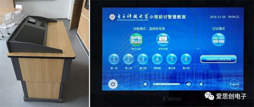 每間教室均配備有 Extron TLP Pro 725M 觸摸屏,它支持 IPCP Pro 控制處理器,因此可通過網絡實現對室內設備的控制。所有 TouchLink Pro 觸摸屏的界面均可通過 Extron GUI Designer 免費軟件來按照用戶的需求進行輕松快捷的定制。將所有教室的觸摸屏設置為統一的操作界面,可有效簡化技術人員的配置和調試過程,同時也為日常教學中老師和學生的使用操作帶來了極大的便利。