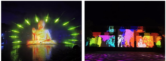 同樣,“根宮夜宴”的“水幕電影”場景也是由鴻合工程團隊,采用NEC PH3501QL+工程投影機打造,精彩紛呈的投影燈光秀,與環繞四周的“萬佛歸宗”、上空的“空中佛影”等場景,形成一個整體,全方位、多維度的光影融合,帶來一場震撼人心的視聽盛宴。