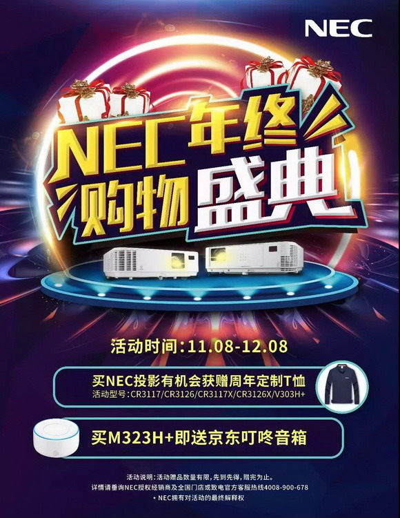 購(gòu)買(mǎi)NEC CR3117、CR3117X、CR3126、CR3126X、V303H+投影機(jī)的客戶(hù),均有機(jī)會(huì)獲贈(zèng)NEC 120周年紀(jì)念版POLO衫。而購(gòu)買(mǎi)M323H+投影機(jī)的客戶(hù),則有機(jī)會(huì)獲得京東叮咚音箱。