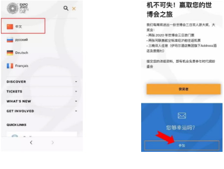 進入Expo2020官網(expo2020dubai.com,或戳文末“閱讀原文”),點“Be there”,跳轉后右上角點長短雙橫線選擇語言