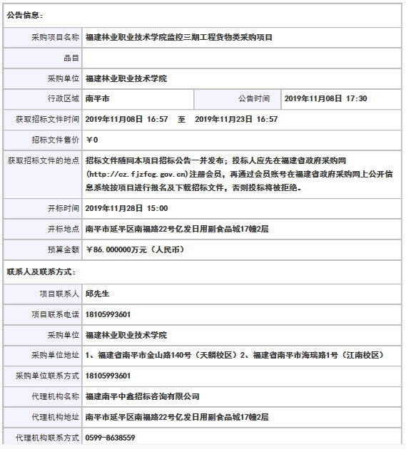 采購項目名稱: 福建林業職業技術學院監控三期工程貨物類采購項目
