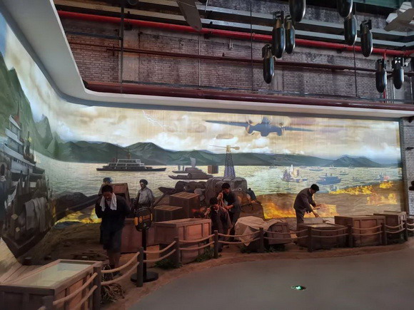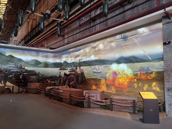 “宜昌大撤退” 半景畫可以說是鋼魂館最亮眼的部分,不僅是它所展示的內容非常壯觀,還因為它采用的投影技術在視覺上非常具有沖擊力。鴻合NEC工程團隊通過4臺NEC PA653UL+工程投影機拼接融合,打造的巨幅展示畫面,以畫面為背景展示廣闊的江面,而實物則放在幕布前,顯示內容與實景相互交織融合,展現一幅壯觀的歷史畫面。