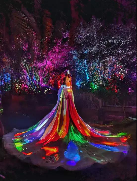 “花仙子”裙擺雕塑高3米,裙面尺寸約直徑6米,且凹凸不平,褶皺迭起。經(jīng)過精心的投影設計,投影畫面完美覆蓋整個裙身。曼妙靈動,裙邊飛揚的造型,配合華美俏麗的投影畫面,瞬間將雕塑變成一條“真正的”錦衣霓裳,滿足了游客對于“花仙子”的美好想象。