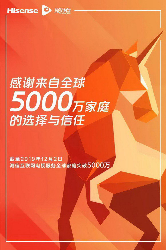 今天,海信旗下互聯網獨角獸公司聚好看發布數據,截至12月2日,其負責運營的海信互聯網電視服務全球超過5000萬個家庭!其中國內家庭3818萬,海外家庭1182萬,行業內首次實現這一歷史性突破,進一步鞏固全球最大的互聯網電視云平臺的領先優勢。