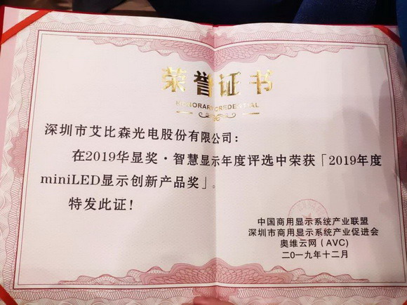 喜訊!艾比森榮獲2019年度MiniLED顯示創新產品獎