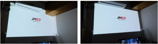 首先就是對我而言最重要的梯形校正功能。以下兩張對比圖可以看出矯正的效果是相當不錯,在進行調整和投影畫面從超出我既定的投影區域變為完美適配這一段空白墻面,效果簡直不要更理想。