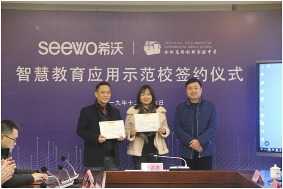 隨后,希沃合肥辦事處銷售總監(jiān)劉駿、合肥高新創(chuàng)新實驗中學吳昌發(fā)副校長共同簽署了希沃智慧教育應用示范校合作協(xié)議。劉駿表示:“希沃有幸與合肥六中高新學校簽訂智慧教育應用示范校合作協(xié)議,此次合作標志著希沃將就信息