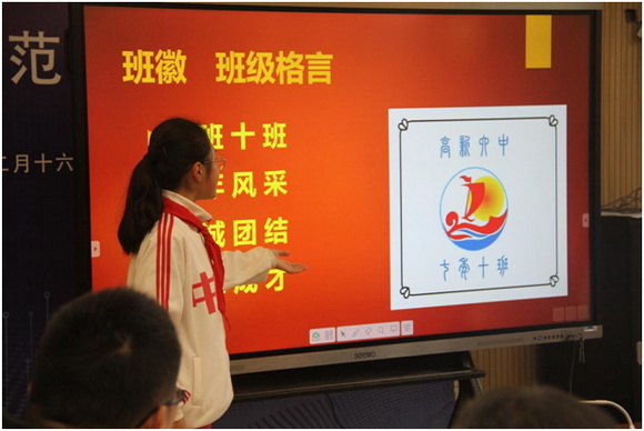 此次比賽由七年級十個班參與,以學生、老師、家長三方共同協(xié)助的形式,自主設計班級風采展示內容。包括班徽設計、班級格言、教師風采、班級考勤、班級成員風采及班級榮譽等多維度展示,激發(fā)了同學們的積極性和創(chuàng)新性。經過一個多月的精心準備,由學校、家委會、希沃三方代表組成評審小組,深入各班級實地查看班牌使用情況,并依據評分標準現場打分,F場展示環(huán)節(jié),各班級代表詳細闡述了作品的設計理念、創(chuàng)新性等亮點。經過激烈角逐,最終七(九)班、七(十)班獲得活動一等獎,參會領導依次為獲獎班級頒發(fā)證書。