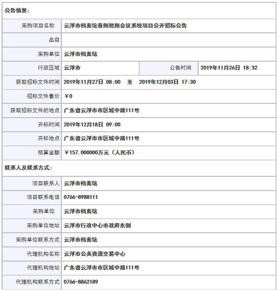 采購項目名稱: 云浮市檔案館音頻視頻會議系統項目公開招標公告