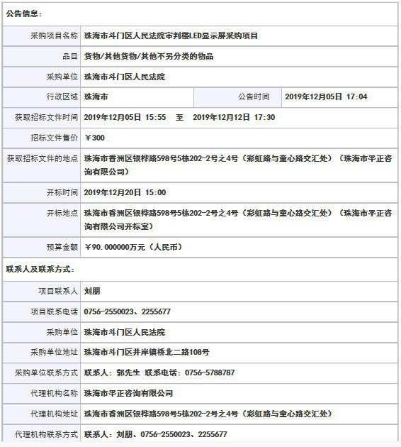 采購項目名稱: 珠海市斗門區(qū)人民法院審判樓LED顯示屏采購項目