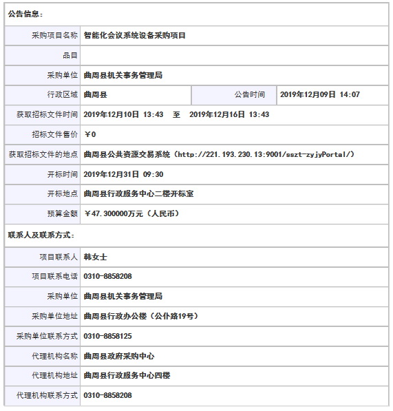 曲周縣機關事務管理局智能化會議系統設備采購項目招標公告