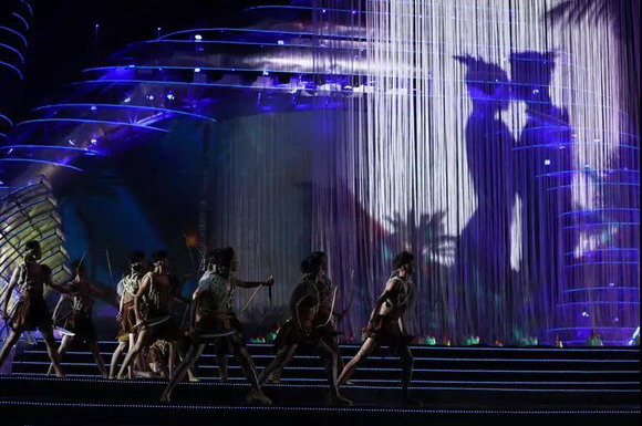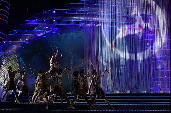名為《神鹿傳說》的創意舞蹈秀成為閉幕式一大精彩節目,夢幻的雨絲幕墜散開來,一場浩大的海陸空盛大場景浮現于眼前。舞蹈秀由4臺4萬流明NEC PH3501QL+ 投影疊加實現16萬流明高亮度,在舞臺中央架設起的20m*10m雨絲幕上營造出夢幻影像。
