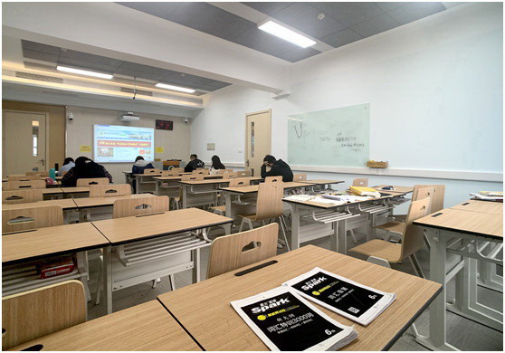 接下來,我們來到了小型階梯教室,這里可以容納約140人,適合同時(shí)為2-3個(gè)班級(jí)講授大課。講臺(tái)旁,一臺(tái)VPL-U300WZ投影100英寸交互白板,旁邊是一臺(tái)VPL-P500XZ投影100英寸屏幕,兩個(gè)畫面并列呈現(xiàn),讓教室兩側(cè)的學(xué)生都能看到課件內(nèi)容。