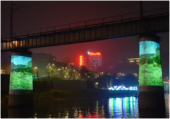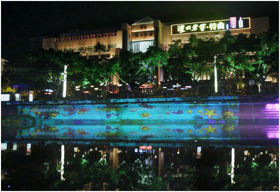 繼續順流而行,兩岸燈光繁華,在善后橋與洞天福地張家沱交匯處,燈光與投影秀利用沱灣獨有的地理優勢將夜游推向高潮。4臺VPL-F1205ZL在河堤上拼融投影了一幅精美的長幅畫卷,影像中水波蕩漾,錦鱗游泳,與溪水倒映成趣。