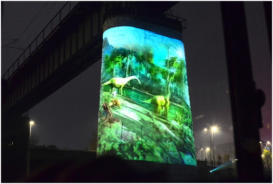 泛舟水面,游船從長310米,由415根骨架組成的“龍韻棧橋”景觀邊緩緩駛過,燈光與水霧為河岸蓋上一層朦朧的面紗。游船緩緩停在鐵路橋下,游客們突然發現,位于船兩側的兩根巨大橋墩變成了投影秀巨幕!6臺VPL-F1205ZL投影覆蓋兩個橋墩的大畫面,四五層樓高的動態影像非常震撼,娓娓道來恐龍演化的歷程;畫面倒映水中,與堤岸華燈交相輝映,讓人耳目一新。