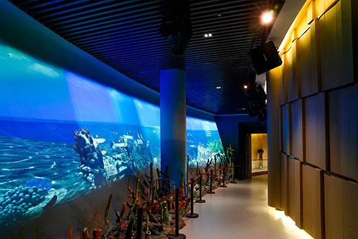 “萬年生態多樣性”展項巧妙利用大型坡道空間,通過索諾克激光工程投影機結合半景畫場景,以三維動態影片繪就了一幅生態畫卷。在曲徑通幽的閩侯生態斜坡長廊,22臺索諾克SNP-LU6600激光工程投影機一字排開,以其色彩的高度一致性和4K高清畫質展現閩侯海洋環境和生態環境的變化。