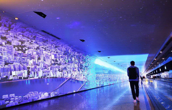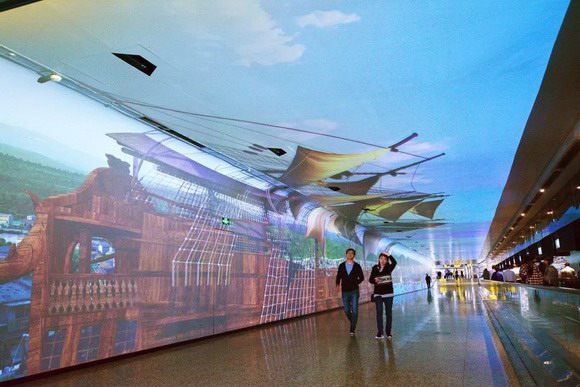 經常乘坐飛機出行的朋友,特別是飛廣州的朋友一定知道白云機場“絲路穿越”之“時空隧道”。隧道全長約200米,面積超過了2500平方米,借助新科技打造的“動靜結合、人景結合、虛實結合”炫酷時空長廊,集公共服務、藝術展示、廣告發布于一體,是該機場首推的融媒體模式大型藝術體驗新空間,在全國機場尚屬首創。