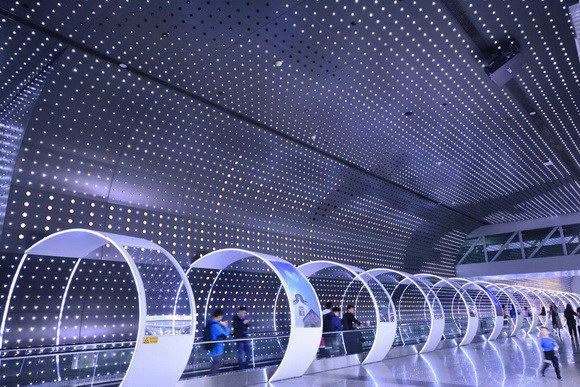 全程突出“云+”的概念,分為“云之‘家’‘夢’‘心’‘城’”四個空間,整體以“云”為設計主元素,既與“白云機場”的“云”相呼應,又寓意飛機穿越云端,與未來“云時代”對話。白云機場相關負責人介紹,打造特色“時空隧道”,通過前沿技術帶來科幻特色體驗,一方面重在增加地方特色和機場特色;另一方面提升旅客出行體驗。