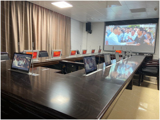 會議室作為溝通、決策的議會要地,設計的無紙化會議系統管理平臺,按會議室布局,配置了14點位的1080P高清液晶雙顯帶話筒升降一體機,可提供會議通知、會議發布、會議簽到、投票表決、同屏批注、投影、視頻播放、交互式電子白板、語音轉文字識別、呼叫服務、一鍵文件加密歸檔等豐富的會議服務功能。