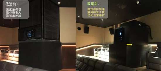 英皇電影城(深圳東海濱紛店)是實力強勁的高端商務(wù)影城,建設(shè)之初沒有完善的無機房放映解決方案,全部采用了簡易的安裝方案,僅在放映機周圍安裝了百葉窗和隔音板的吊裝架,其溫度維持,運營維護,和機器運行噪音都令英皇人頭疼不已。