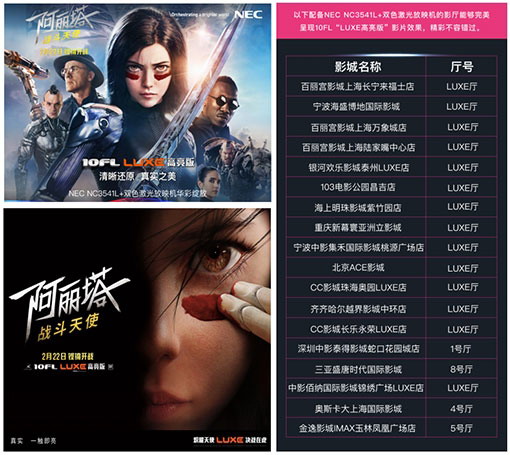 明日,《阿麗塔:戰斗天使》正式登陸全國院線,3D制作技術的革命性旋風高能來襲!NEC NC3541L+雙色激光放映機將為你完美還原10FL高亮版本!NEC與你一同見證唯美恢弘的特效,領略科幻大師卡梅隆十年傾心之作。