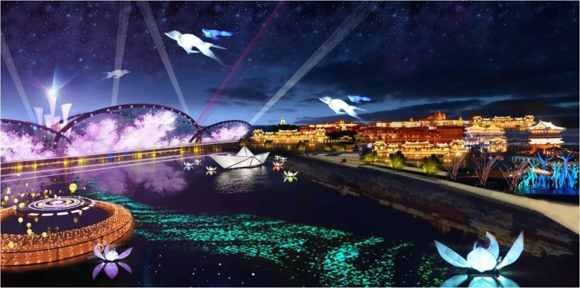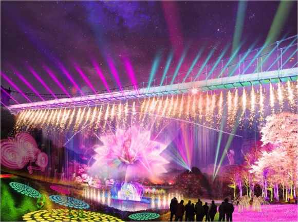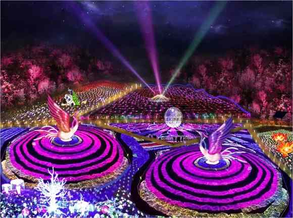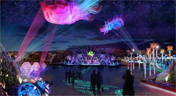 用燈光點亮同心廣場(LED舞臺的各大節慶互動表演);彝肆美食點亮煙火人間;索瑪開花點亮愛渡的河谷,讓城市的每一塊草坪,每一條河流,每一個公園,都在光影的交織中美如仙境。通過水幕投影、藝術街燈、娛樂設施等亮化、讓城市沉入光影的海底。
