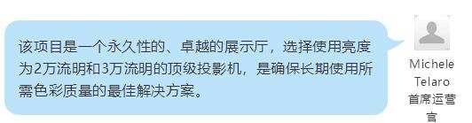 活動管理人和負責沉浸式視頻投影系統的設計與安裝的系統首席執行官Daniele Parazzoli表示:“選擇松下投影機,無疑是為了達到藝術總監所要求的高亮度,并且松下品牌在激光與DLP相結合的技術方面是非常值得信賴的”。