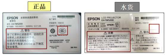 正版愛普生投影機的機身有清晰、簡潔的簡體中文說明,并且機身貼有“中國強制認證”標志(3C標志),而假冒的愛普生投影機并沒有“3C”標志,且機身的說明是外文。
