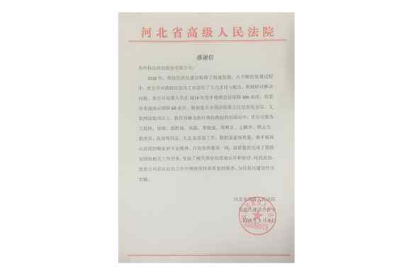 河北省高級人民法院授予科達的感謝信