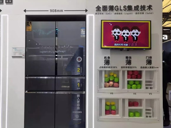 此外,長虹在AWE展出的美菱“全面薄”冰箱集機身薄、箱體薄和門體薄三位一體,較常規(guī)冰箱容積率增加20%、少占地38%,1cm的距離可以輕松正常使用,讓人眼前一亮。