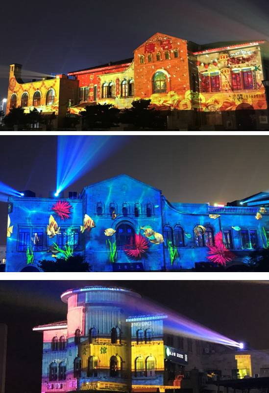 EPSON 青島項目3D mapping投影到8個廣場周邊建筑物,采用了24臺25000LM 3LCD激光高清投影機(jī)。由于建筑物的面積夠大,投影畫面到建筑物上來創(chuàng)造出來超現(xiàn)實的主題畫面,凸顯了奇幻和震撼的視覺效果。