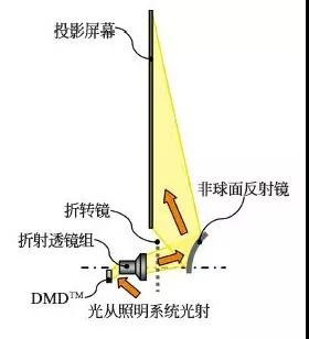 激光電視作為超短焦投影,除了在機身內部采用超廣角鏡頭之外,在內部設計上往往也采用反射式的布局,通過在光路上布置反射鏡,讓光線反轉投射到幕布,相當于在有限的機身體積內增加了投影距離,投影比當然也就進一步縮小了。