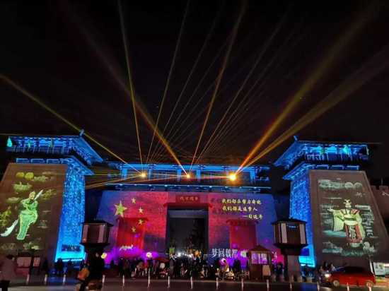 夜幕降臨,伴隨著激昂的音樂聲,一束束色彩斑斕的燈光從南城門上打出,與此同時(shí),蘊(yùn)含著三國歷史文化的各種畫面也被投射到城門上方,曹操的雄才偉略,關(guān)羽的義薄云天,都為您呈現(xiàn)了三國故地最華美的樂章。