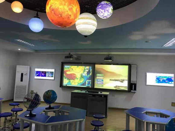 羿飛環(huán)幕示教系統(tǒng)幾乎占據(jù)了一整個墻面,專用于地理視頻資源的播放。巨大的屏幕帶來震撼的視覺沖擊,直觀地展示事物發(fā)展的動態(tài)過程,讓課程內容變得更生動有趣。視頻課件對課程的導入、過渡作用,使課程進行得更自然順暢。