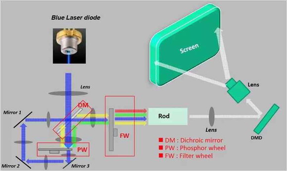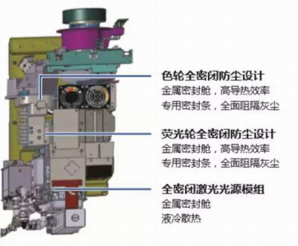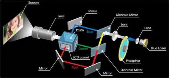DLP技術是激光光源通過透鏡和色輪,經過DMD芯片的數字處理,最終將畫面投射到屏幕上的一種技術手段。