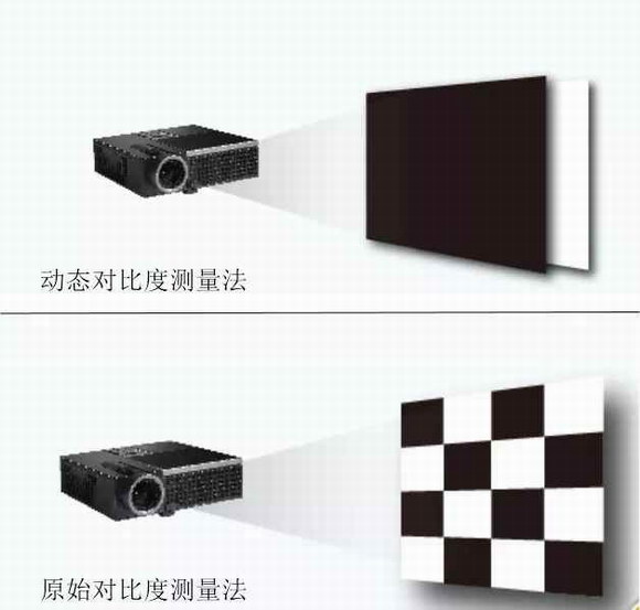 動態(FOFO)對比度是指投影機輸出全白屏幕(全開)與輸出全黑屏幕(全關)之間的亮度比值,此種測試方法所測出的對比度往往比原始對比度高出很多。原始對比度則是采用ANSI標準測量方法,在16塊黑白相間的色塊中,8塊白色區域亮度平均值和8塊黑色區域亮度平均值之間的比值。原始對比度的測量方法更接近實際使用情況,因而更具備考察性。通常,原始對比度高于200:1便能夠顯示出清晰的灰階,采用DLP投影技術的投影機在這方面具備一定優勢。