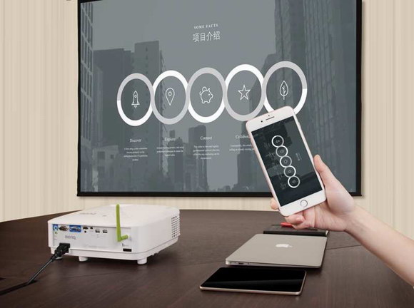 因此,給會議室安排一臺支持手機投屏的投影機就顯得有必要。比如智能商務E系列,直連投影機WiFi,就能投屏手機畫面到投影機大屏幕上,誰說App廣告只能抱著手機看?有了E系列,手機也能無線投屏。