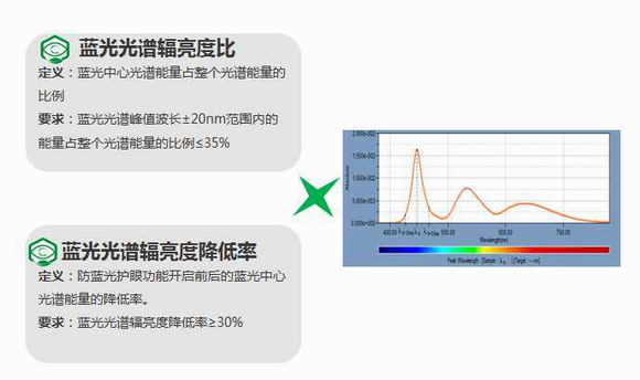 《規范》的出臺引發了全社會的熱議。《規范》從亮度、對比度、色域覆蓋率(Rec709)、清晰度、分辨率、響應時間、閃爍七個指標來評價顯示性能,以此來確保產品顯示效果更加豐富。在視覺健康方面,規范要求:藍光光譜峰值波長±20nm范圍內的能量占整個光譜能量的比例≤35%;藍光光譜輻亮度降低率≥30%,從藍光光譜輻亮度比、藍光光譜輻亮度降低率兩個指標來評價藍光輻射程度,以此來確保產品的光生物安全性。規范還要求產品工作噪聲≤35dB(A),以此達到低噪聲目的。