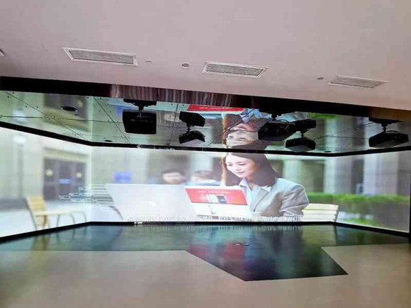 展廳共采用18臺NEC激光工程投影機(jī),重點(diǎn)打造了3個數(shù)字展項。其中兩個展項是一大一小兩套折幕顯示系統(tǒng),分別應(yīng)用了5臺NEC PA653UL+和3臺NEC PA653UL+,通過多通道融合技術(shù)實現(xiàn)超寬的顯示界面,用于播放宣傳片以及公司業(yè)務(wù)介紹。