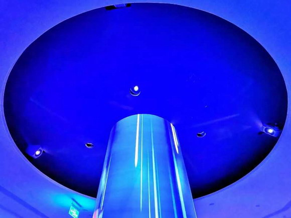 此展項共采用8臺NEC 5000流明的P502WL+激光工程投影機(jī),4臺投射圓柱體表面,4臺垂直投射于下方。P502WL+能任意角度旋轉(zhuǎn)并垂直縱向安裝,正好適配該展項,方便的鏡頭位移等調(diào)試功能讓復(fù)雜的施工程序變得更加容易。