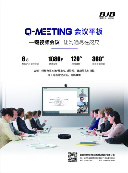 Q-Meeting 智能交互會議平板是BJB 同輝信息自主研發的會議平板,具有智能和簡單的突出特點。內置Android系統,標配的智能筆具有原筆跡書寫功能,更可支持一鍵批注、一鍵切換顏色、上下翻頁等,實現對屏幕的智能操控。Q-Meeting操作簡單具有一鍵開啟會議功能,搭配4畫面無線投屏、原筆跡白板書寫、6方遠程視頻會議、任意界面批注和一鍵掃碼分享,滿足了現代會議室中對簡捷和智能化的需求,可廣泛應用于遠程會議、互動營銷、網絡課堂、在線培訓等場景。